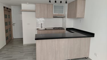 El apartamento cuenta con dos habitaciones, un baño, zona de lavandería y una zona cocina salón abierta